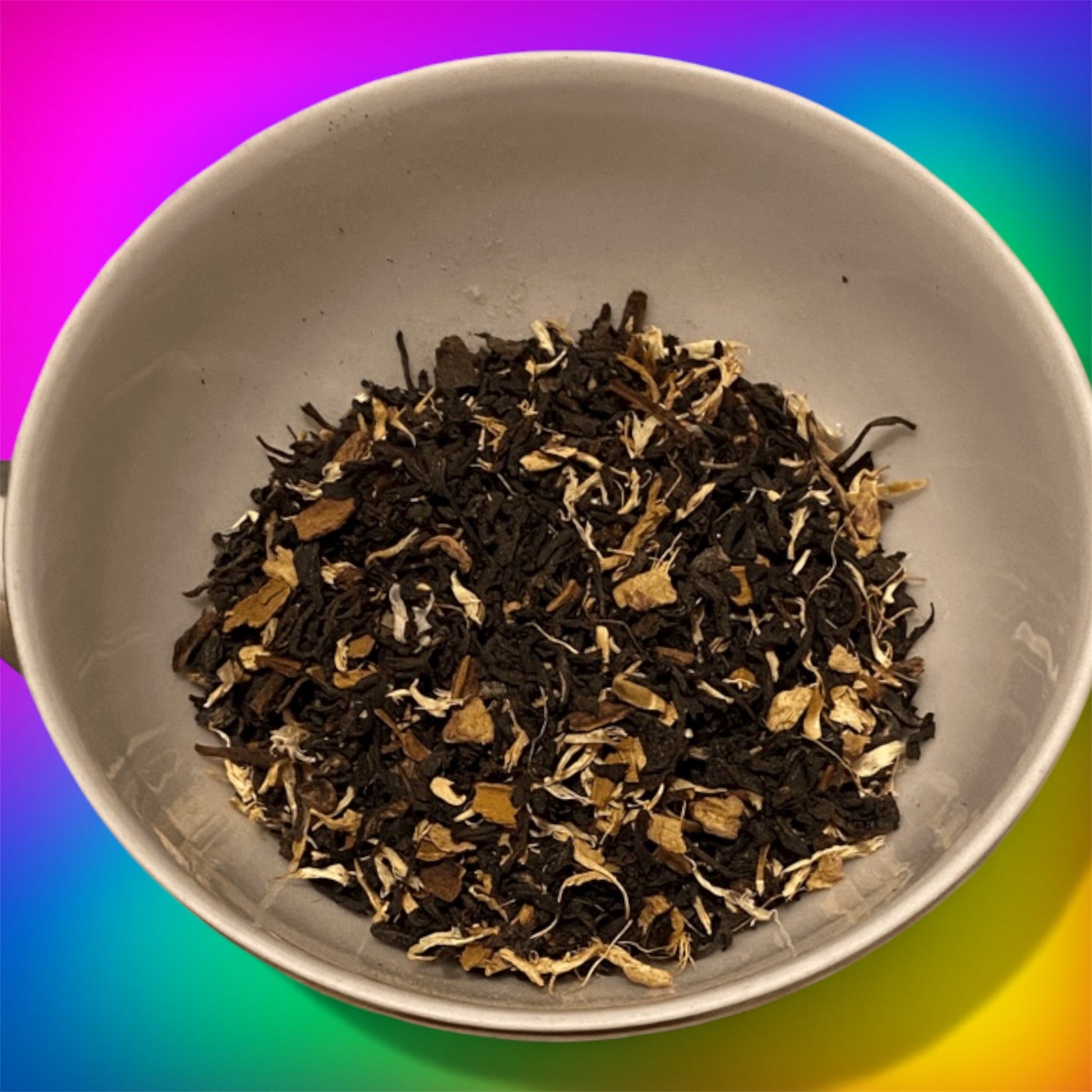 ♥️Black Tea, cinnamon, Ginger, Cocoa Nibs, Natural Chocolate Flavors & Natural Cinnamon Flavors.