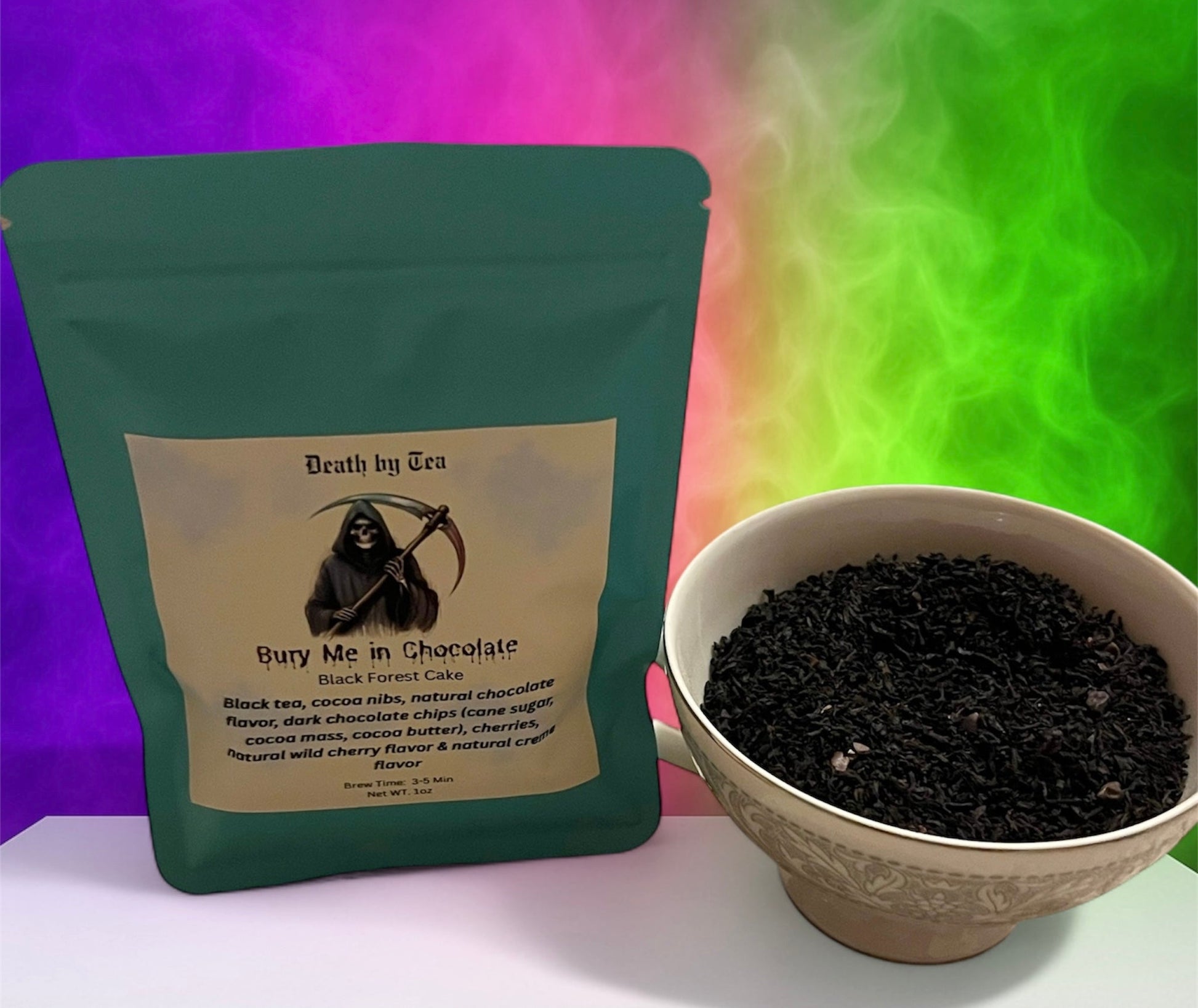♥️black tea, cocoa nibs, natural chocolate flavor, dark chocolate chips (cane sugar, cocoa mass, cocoa butter), cherries, natural wild cherry flavor & natural creme flavor