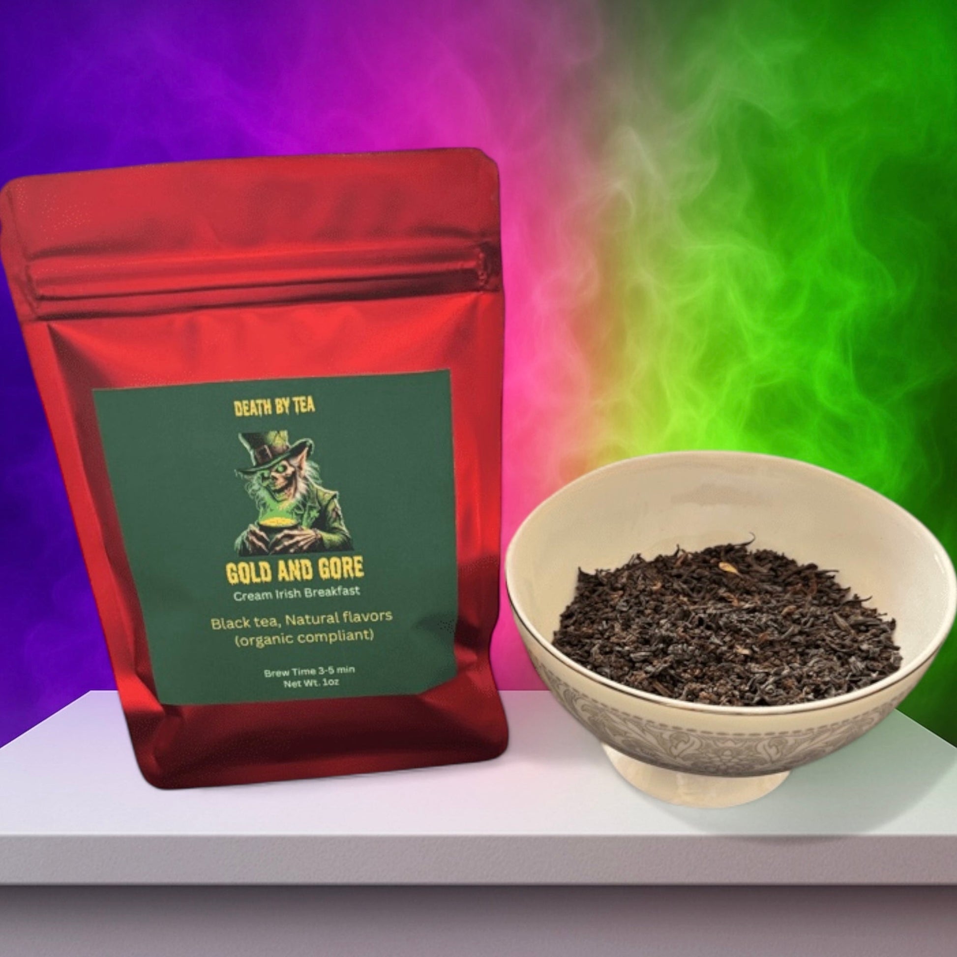 Start your day with a tea as bold as a legend and as smooth as a ghosts whisper. Gold and Gore blends rich, malty Irish Breakfast tea with a creamy twist, making every sip a hauntingly good experience.