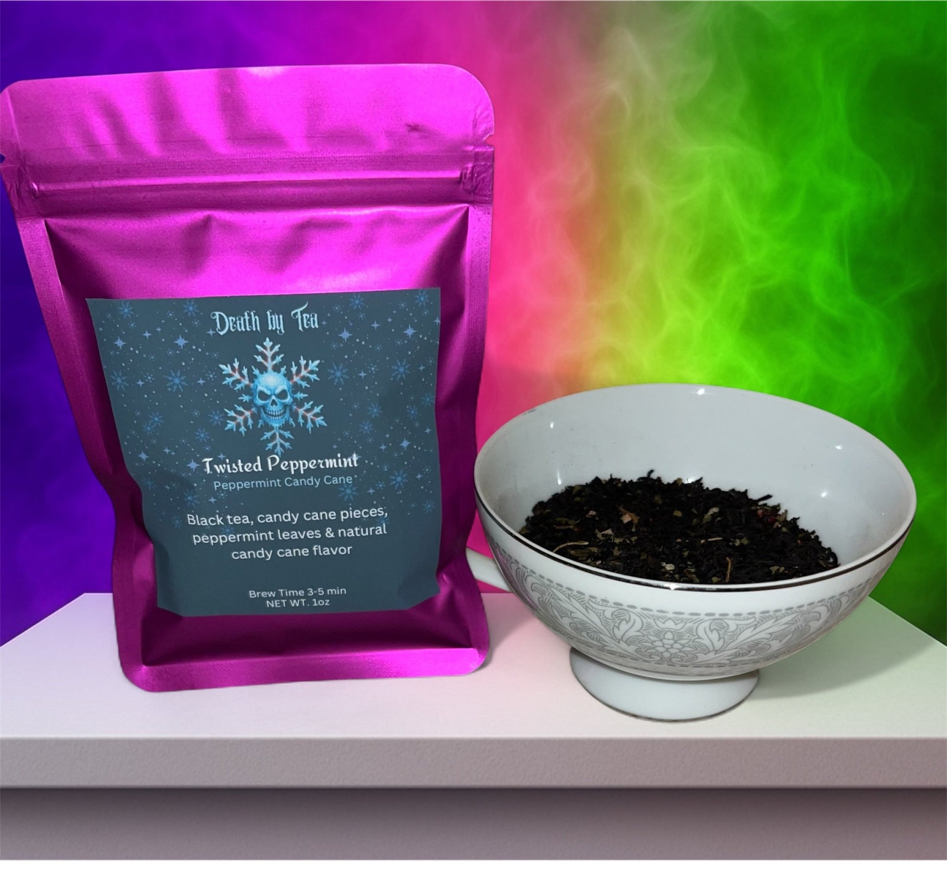 Twisted Peppermint Loose Leaf Tea casts a bewitching spell with its hauntingly sweet aroma of peppermint candy canes.