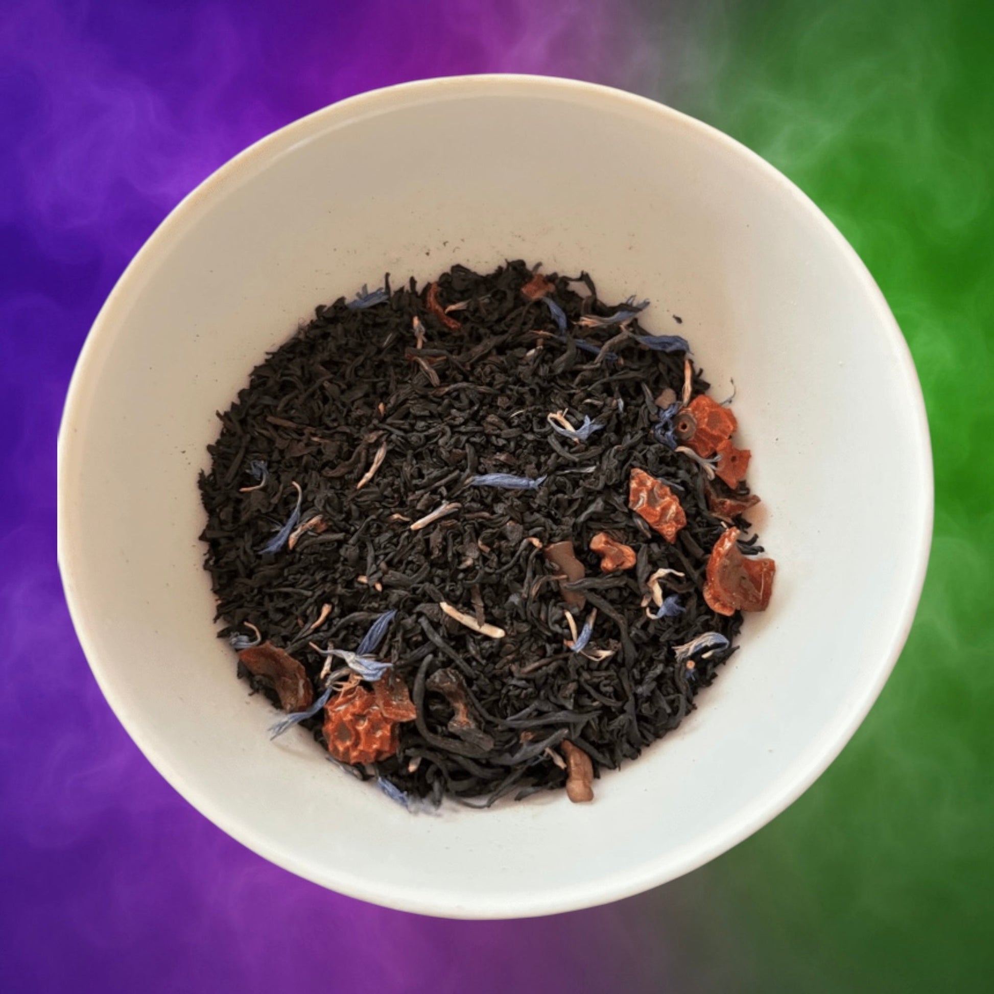♥️ Black Tea, Keemun Concerto Tea, Rose Hips, Cocoa Nibs, Lapsang Souchong Tea, Whiskey Flavor, Blue Cornflowers, Natural Vanilla Flavor & Natural Candy Apple Flavor